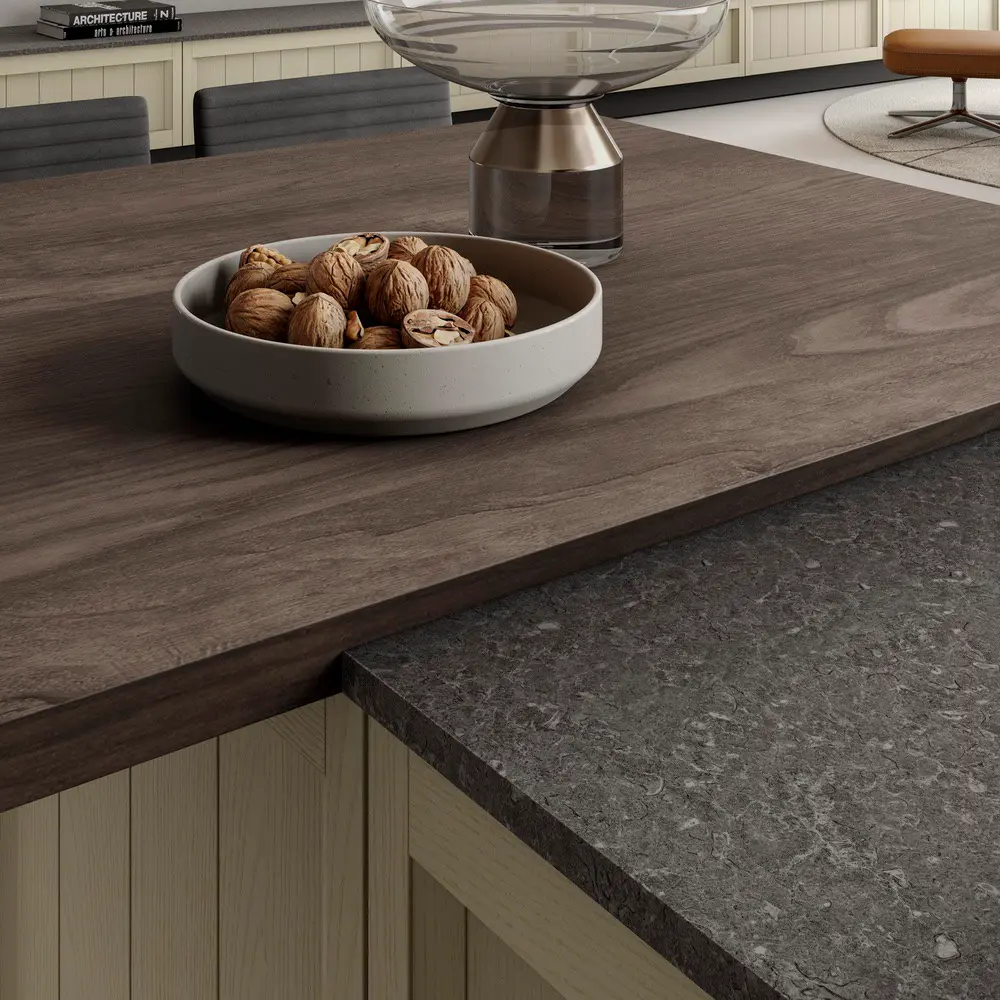 Programul de bucătărie Saona include uși încadrate de frasin cu lamele pantografate și mâner pe traversă, grosime de 22 mm.