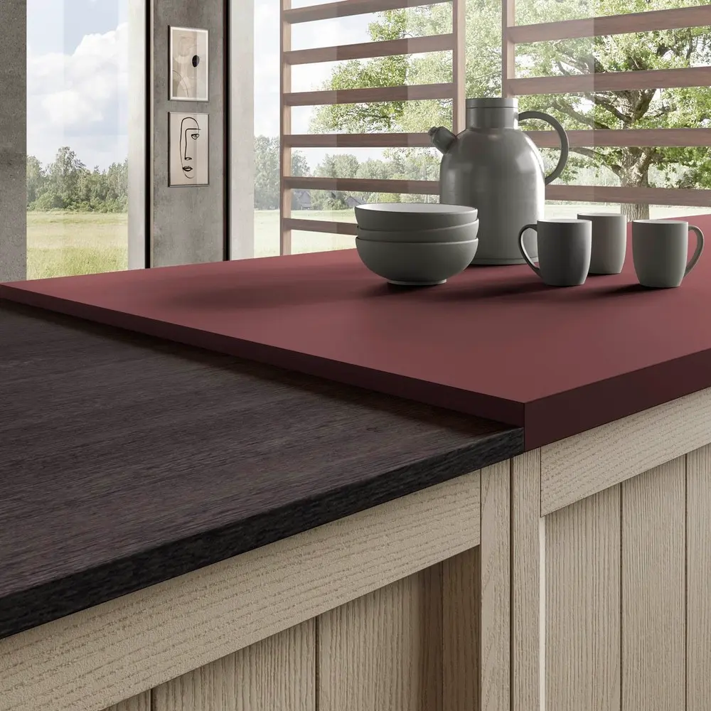 Combinații de culori rafinate și soluții practice se amestecă în acest compozit caracterizat printr-o notă elegantă de culoare dată de blatul fenix în roșu Jaipur.